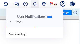 Q - User notification - shows the User Notifications dropdown in a web app. Clicking the bell icon reveals a “Logs” section with a “Container Log” option, which redirects to a detailed log page for real-time error and system monitoring.